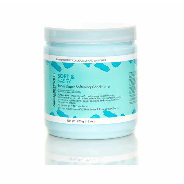 Aunt Jackie's Girls Soft and Sassy Super Duper Softening Conditioner is a "Triple Threat" conditioning treatment that is enriched with Coconut Oil, Shea Butter & Extra Virgin Olive Oil. Aunt Jackie’s GIRLS Soft & Sassy is a multiple-use conditioner that can be used as a co-wash, deep conditioning treatment or a rinse out conditioner. It works quickly to help soften and loosen tight coarse textures.