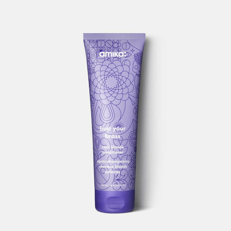 Amika: Brass Cool Blonde Repair Conditioner Achieve your brightest + healthiest blonde while you wash. Bust Your Brass is now formulated with bond cure technology, vegan proteins, and plant butters to hydrate, repair, and strengthen damaged hair, while ultra-violet pigments tone brassy hues.