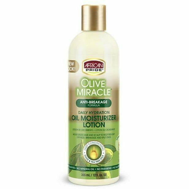 African Pride Olive Miracle Anti-Breakage Formula Moisturizer Lotion is rich in extra virgin olive oil for the ultimate in silky-smooth, deep-conditioned hair and a moisture-rich healthy scalp.