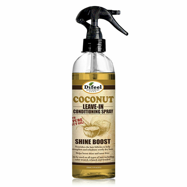 Difeel: Coconut Oil Shine Boost Leave-In Conditioning Spray nourishes the hair follicles to help strengthen and rehydrate overly dry hair. Helps boost shine and tame frizz. Can be used on all types of hair including color treated, relaxed, and braided.