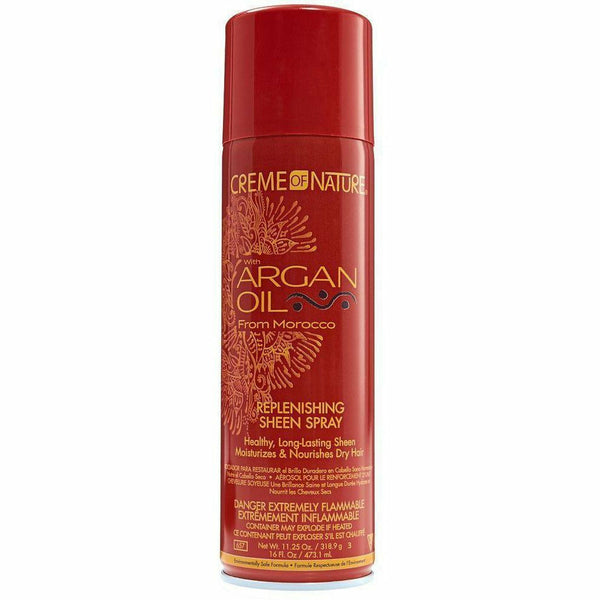 Creme of Nature with Argan Oil Replenishing Sheen Spray is a high-gloss sheen with advanced moisturizing properties that gives hair a lightweight, soft finish, protects hair from styling friction damage, and improves compatibility. With an exotic new fragrance and vibrant Moroccan-themed packaging, these products combine the healing properties of Argan Oil with advanced formulas that give unparalleled performance.