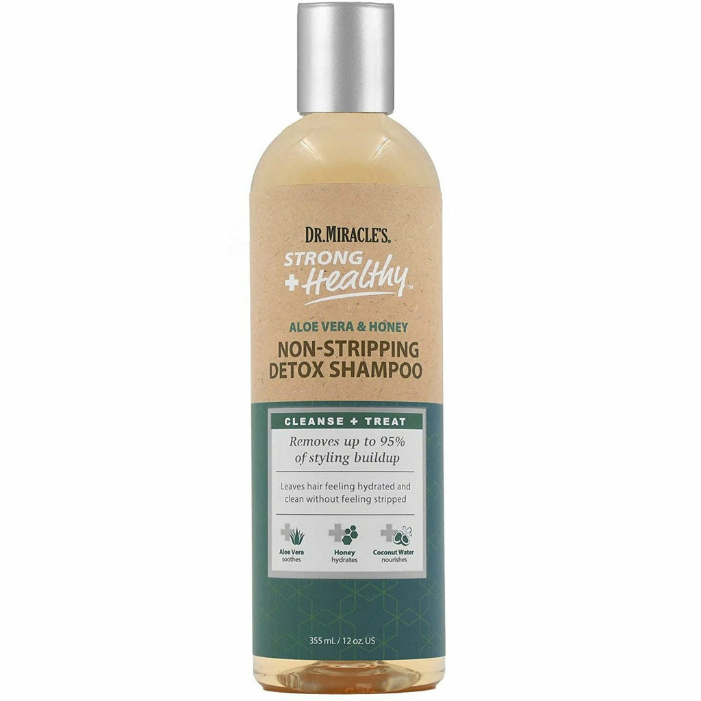 Dr. Miracle's Strong+Healthy Aloe Vera & Honey Non-Stripping Detox Shampoo moisturizes dry hair as it effectively removes product build up and environmental impurities.