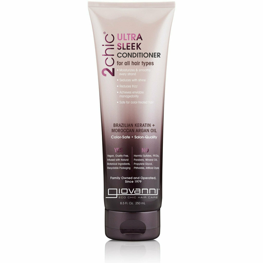 Directions: After washing with 2chic Brazilian Keratin & Moroccan Argan Oil Ultra-Sleek Shampoo, massage Giovanni Ultra-Sleek conditioner into wet hair from roots to ends. Rinse. Delight in magnificently smooth and shiny hair. For style that lasts, finish with our Ultra-Sleek Soft hold gel or styling wax.